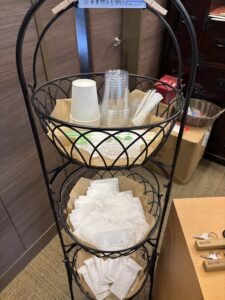お部屋にコップはないのでここで調達できます。どれが誰のコップかわからなくなるので名前ペンでも1本置いてあるとさらに便利そう。