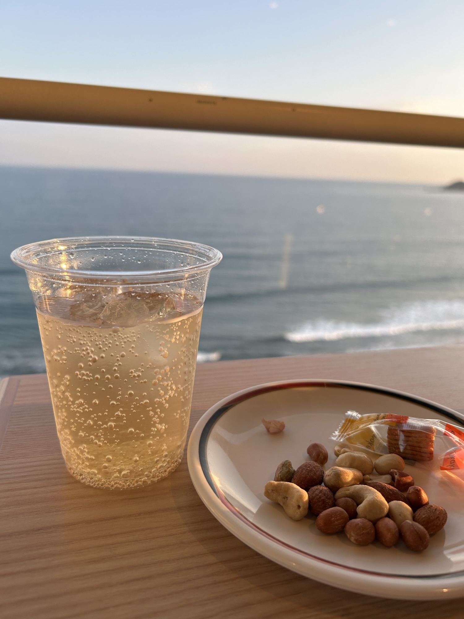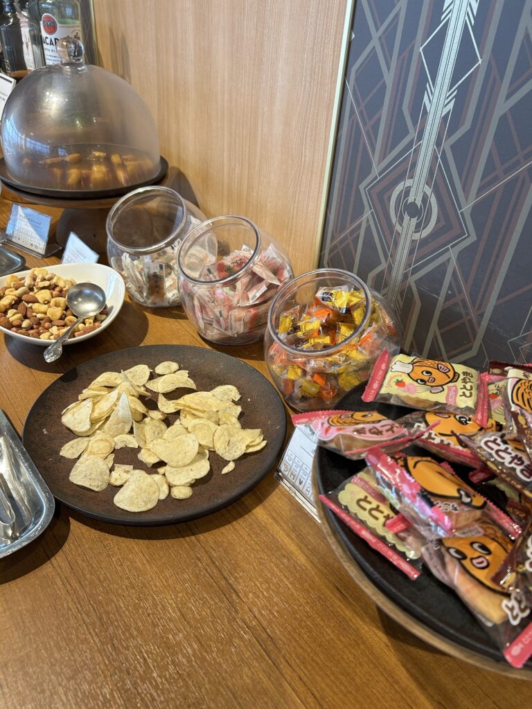 ナッツがあるの嬉しい。奥のガラスドーム(?)に入ってるのは大学芋みたいなやつでした。夜ご飯があるからここではナッツ以外は我慢です。